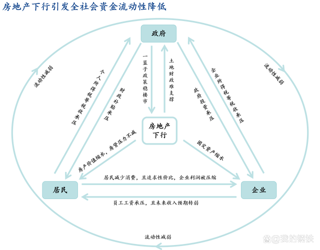 據前文所述,需求疲軟是物價低迷的表觀原因,深究則可能是消費者的資產負債情況惡化以及收入預期轉差:地產行業進入下行周期,房價的持續下跌一方面導致居民和企業的資產負債表惡化,縮減支出;另一方面也使財政收入承壓,疊加前期擴表的債務清償壓力,共同導致社會流動資金縮水。