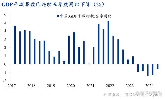 國內生產總值平減指數可以反映整體經濟價格水平,該指標自2023年二季度起,至今年二季度已連續五個季度同比下降,市場擔心該指標可能將下降延續至2025年,這將創下中國自1993年數據開始以來最長的通縮記錄。