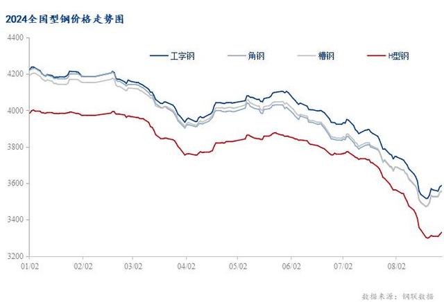 圖1:2023-2024年全國型鋼價格走勢圖 數據來源:鋼聯數據